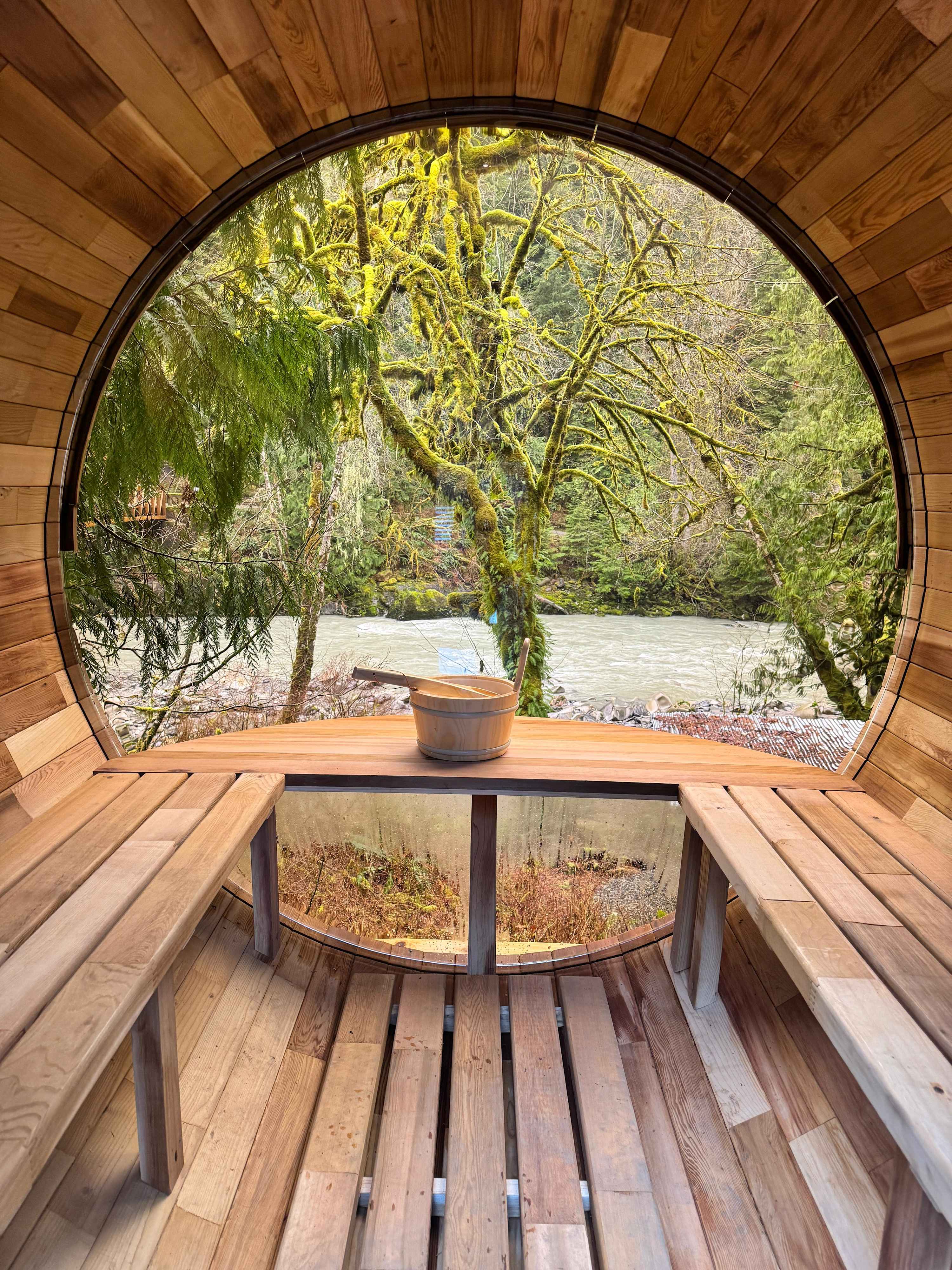 The outdoor setup is what makes this place special: a riverside patio with hot tub, barrel sauna, cold plunge, and chiminea, plus a private covered firepit down by the water. It’s an ideal basecamp for couples, friends, or small families looking to recharge in the woods.