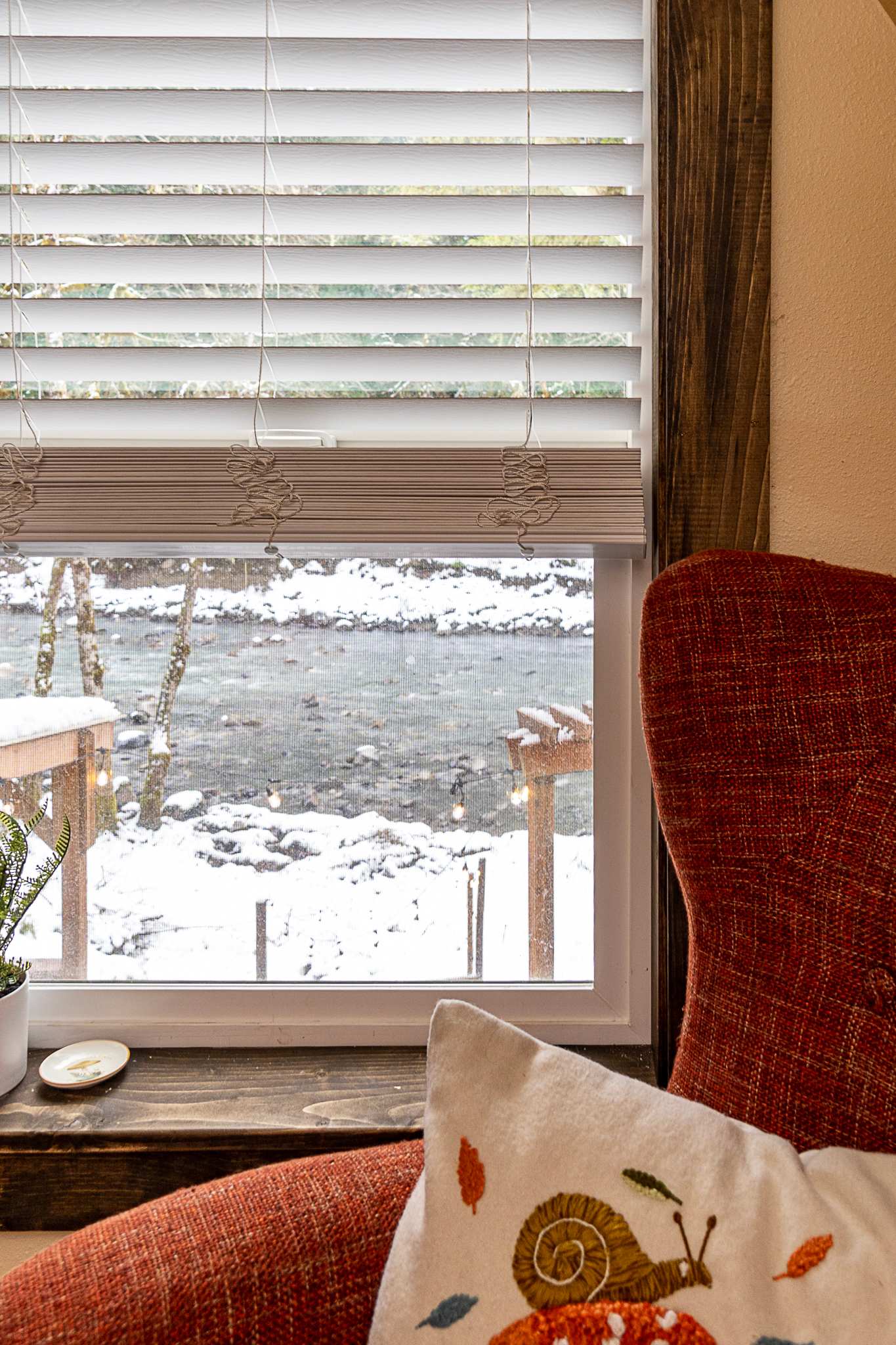 •Outdoors: stone patio with hot tub + fire pit overlooking the river, maple-framed yard, river access