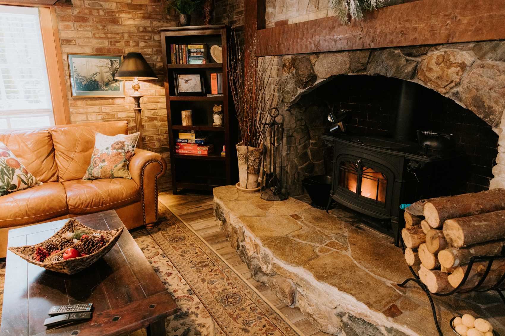 •Living: renovated Tudor charm, grand fireplace, plush seating, smart TV